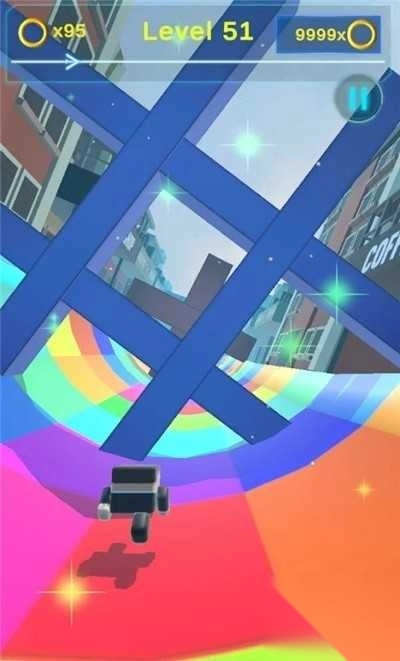 2、于【Level1】彩虹赛道上,留意上方进度条,避开黄色方块状的障碍,维持速度,朝着终点前进。