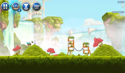把目标锁定在左边立柱最顶端的那块木头,使用小鸟的粉碎技能。如此一来,左边的立柱将会倒塌,掉落的石头砸在中间的锁链上,进而拉动右边的立柱,最终让猪猪摔死。