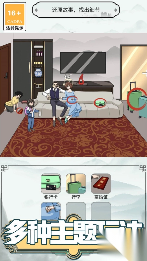 3、需要仔细观察场景中的物品,如银行卡、结婚证、离婚证等,通过还原故事来解开谜题,考验观察力。