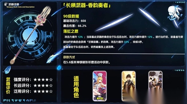 3、搭配:优先给爱可菲(武器伤害期望最高),搭配黄金剧团4件套等圣遗物,最大化输出;也适配钟离等长柄角色。