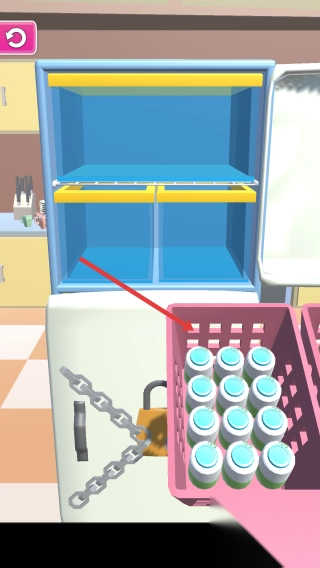 3、进阶收纳:替换物品(如绿色罐装),应对锁链等阻碍,完成冰箱收纳任务。