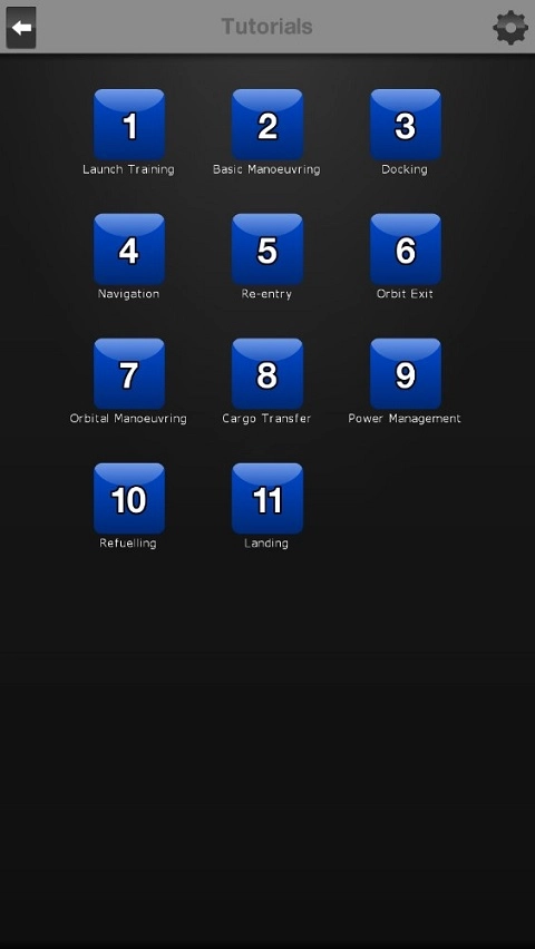 打开教程,其包含的内容依次为发射训练、基本操作、停靠码头、航行、重返、轨道出口、轨道手动、货物转运、电源管理、加油以及着陆。