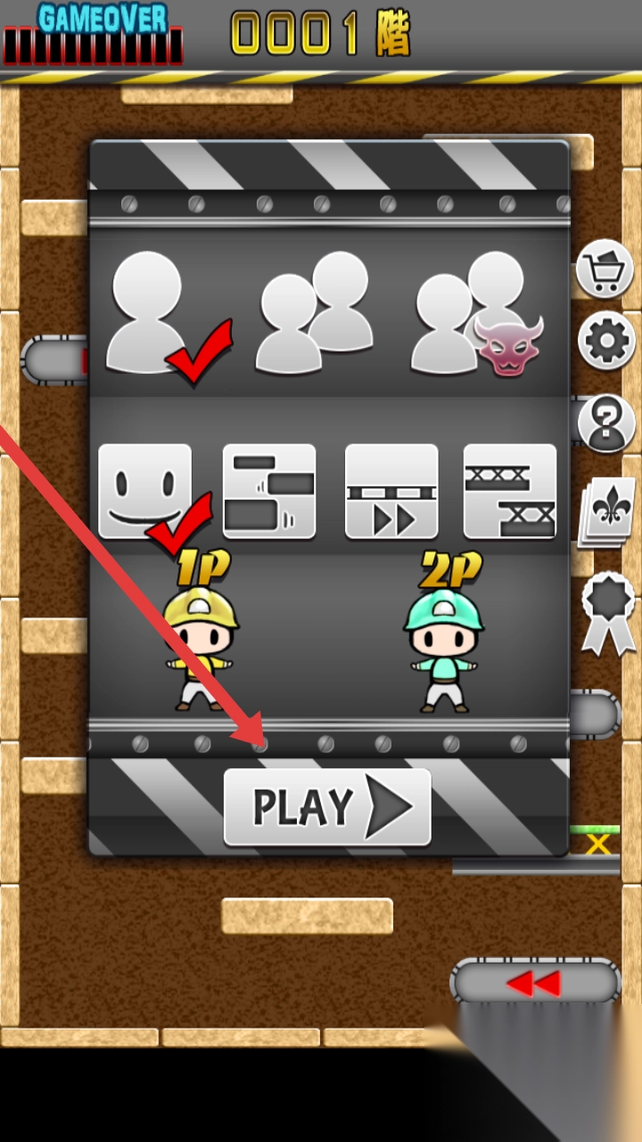 1、在选角界面,当确认1P角色(黄帽小人)已被选中后,点击箭头所指的【PLAY】按钮,即可进入0001階关卡。