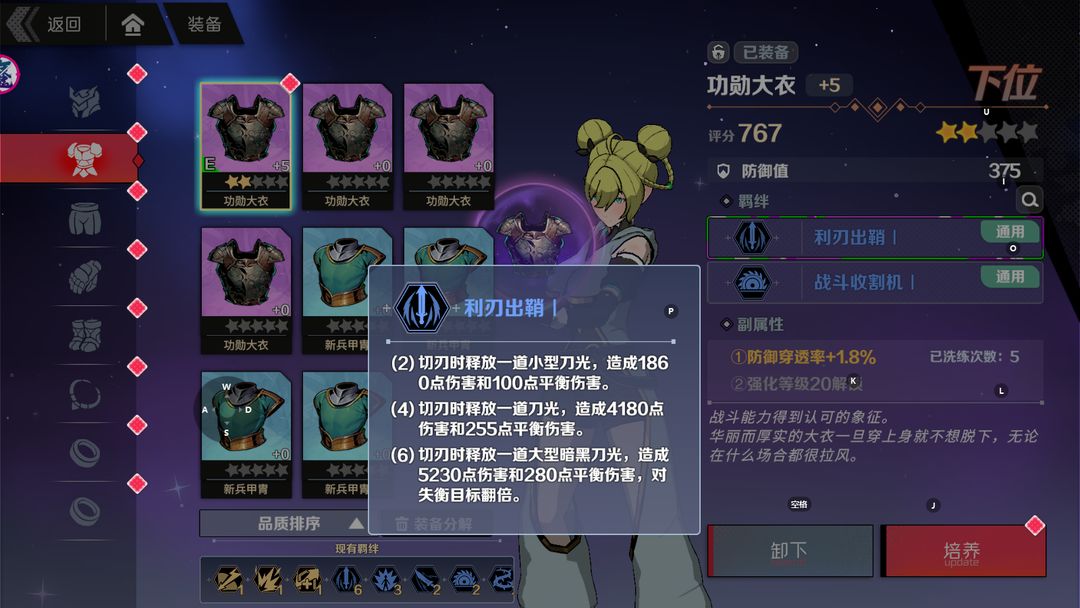 特别提示:前期,凡是初始羁绊为利刃出鞘的装备,不管是蓝装还是其他品质,都不建议分解。
