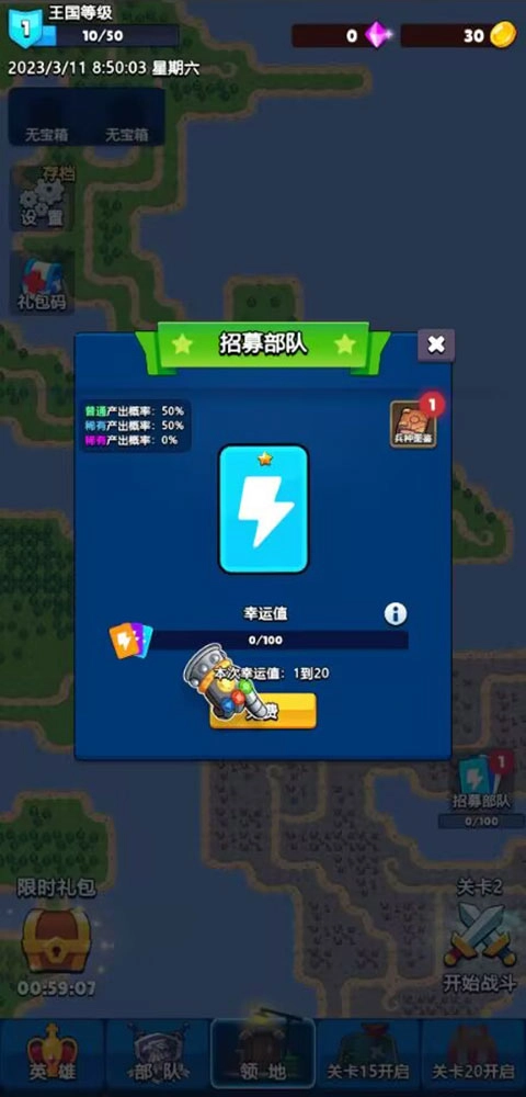 - 推荐选择冰封大陆,原因是其他大陆很容易陷入卡关的困境。当人口数量达到150时会解锁祭祀,不过此时先不用去管它,接着继续通关,等人口达到160时解锁幸运抽奖,把所有金币都投入到抽奖中,在这期间只专注升级冰法,其他方面暂时无需理会。