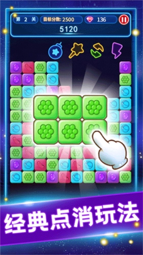 3、多元玩法模式:包含经典、六角、拖动、方块等多种模式,充分满足不同玩家的消除需求。