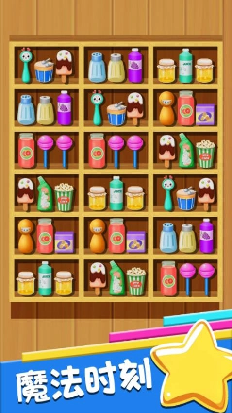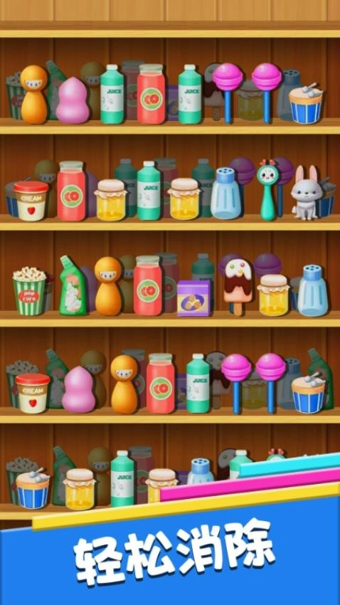 3、消除一组物品后,上方的方块会下落填补空缺,触发新的可消除组合。