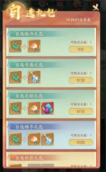 要是大家希望前两天能够冲榜成功,那就把以桃子、瓶子优先的组合全都买下来,这样可以确保你的等级以及仙树等级达到最大化。在这个游戏刚开区的时候,冲榜最关键的就是桃子和瓶子!其他的可根据自身需求来选择。