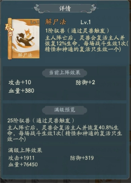驭兽之尸解法:此术具备复活保命的功效,即便是死亡状态,也能够触发勾陈效果。施展此术,角色在被打死后还能起身,闪避敌人攻击后,血量又迅速接近满血状态。