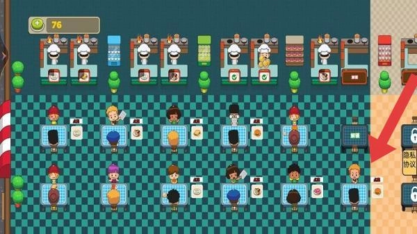2、呈现出餐厅的布局,有顾客、厨师岗位及桌椅等设施,属于模拟餐厅经营玩法,玩家需管理厨师、服务顾客,通过经营解锁更多区域来扩大餐厅规模。