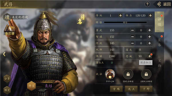 2)接下来是名将的培养,名将能够借助升星、装备强化以及使用经验书来提升四维数据。不过,与君主将有所差异的是,名将可在战斗过程中获取经验,而且将领可通过消耗洗髓丹,把已分配的潜力点进行重置。当将领首次洗点时,会把三维(勇武、内政、智谋)的部分属性重置为潜力点,并且将领的品质越高,洗点所需的洗髓丹数量就越多。