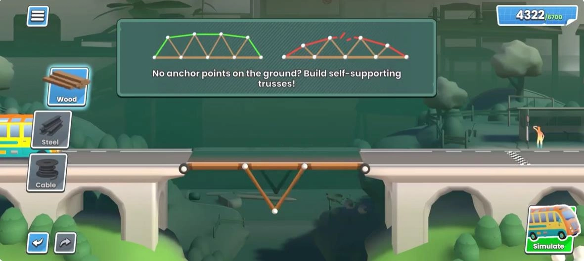 3. 操作方式简洁直观,即使是初次接触建造类游戏的新手,也能轻松入门并逐步熟悉工程建造的核心要点。挑选建材后拖拽构件来搭建桥梁。2、利用压力分析功能检测结构所承受的受力状况。3、对载具通行过程进行模拟,查看桥梁是否稳固并判断是否需要调整。