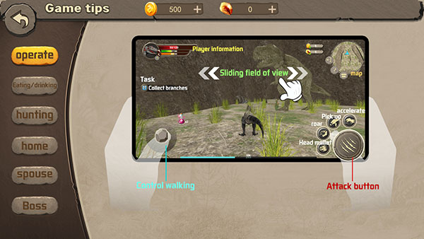 进入游戏后,我们可以通过滑动屏幕来查看视野,左手边的按钮用于控制移动,左上角显示恐龙的状态,右上角是地图及当前所在位置,右手边的大按钮是攻击键,其余按钮则分别对应头槌、咆哮、叼起和加速功能。