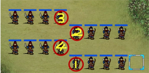 第五回合,左上方出现了三个弓骑兵、三个水寇和三个拳师,我军伏兵随即杀出将这批敌军包围,部分敌军陷入混乱状态。