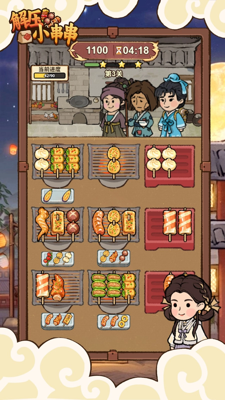 解压小串串是一款以烧烤为主题的休闲益智消除类游戏,玩家将置身于模拟烧烤店的场景里,通过对烤串进行整理来完成消除挑战。游戏内设置了多个关卡,每个关卡都会持续上架不同种类的烤串,玩家需要把烤串移动到烤盘上,一旦同一烤盘上聚集了3个相同类型的烤串,就能实现消除。