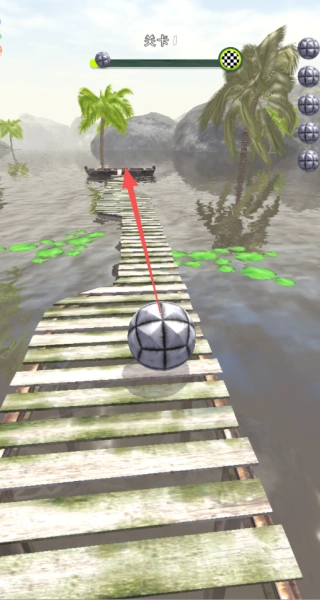 紧盯终点方向,顺着木桥的延伸路径前行,维持铁球的直线运动态势;当遇到桥身狭窄的地方,要缩小滑动幅度,精准把控铁球的平衡,防止其因偏移而掉入水中。