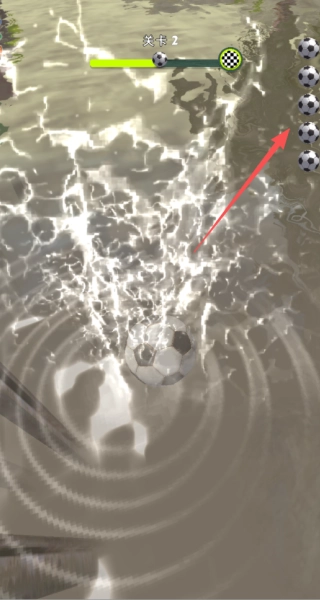 落水后迅速反应,留意右侧足球的排布情况,重新规划路线时优先向足球区域靠近,利用足球的“借力”作用来调整铁球的行进方向。