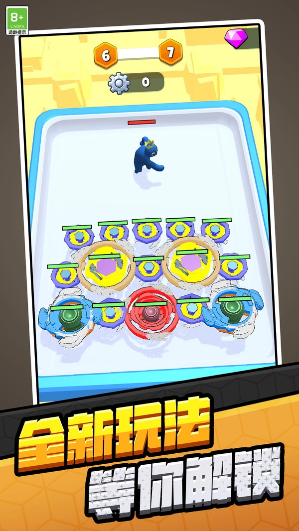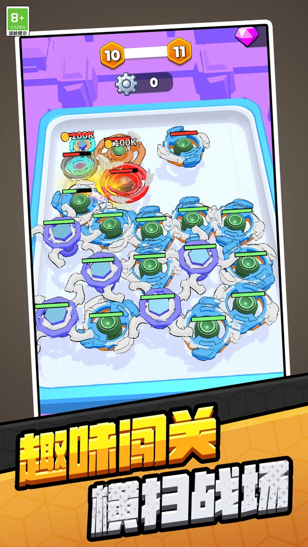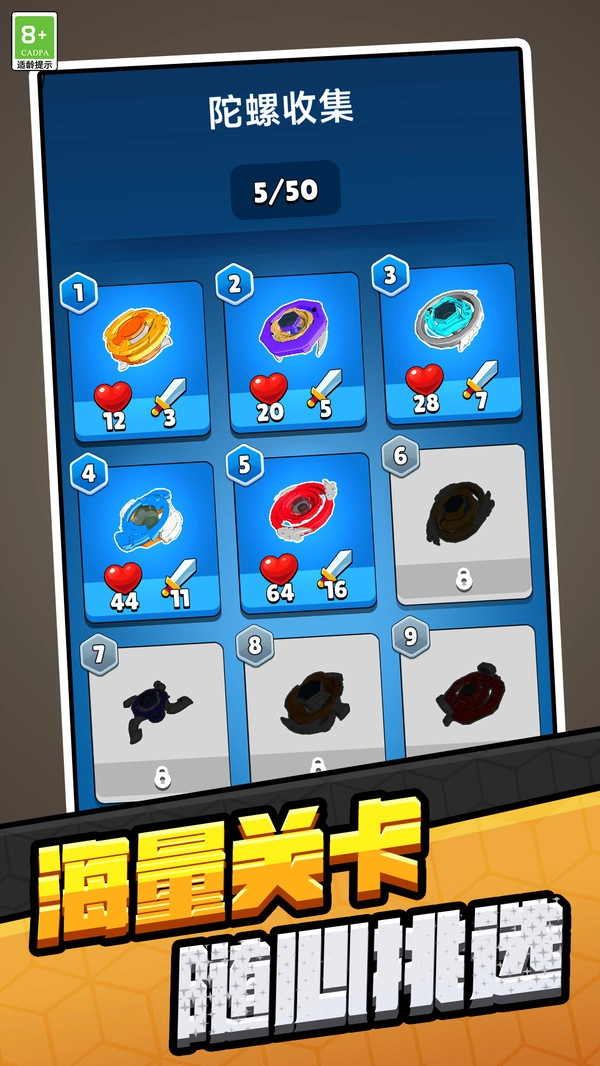 通过合成逐步解锁不同等级陀螺,每个等级陀螺的造型、特效与属性各具特色,满足收集欲与养成期待。