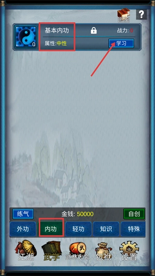 在武学界面切换到【内功】分类,点击【学习】按钮就能解锁【基本内功】,此功法属性为中性,属于基础武学范畴。