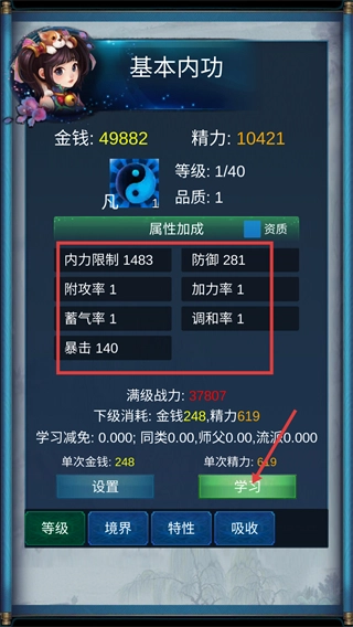 学习【基本内功】后,等级1能获得【内力限制-1483】之类的属性加成,升级需要消耗金钱和精力,满级时战力提升会很明显。