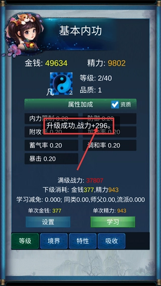把【基本内功】升级到2级能得到【战力+296】的加成,之后升级所需要的消耗会越来越多,要合理安排金钱和精力这些资源。