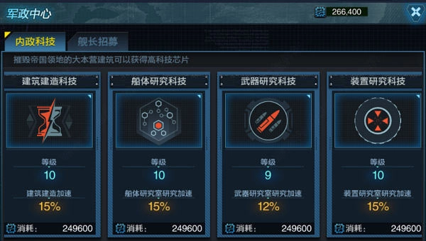 “军政中心”具备军政科技的研究功能,开展科技研究能够提高基地的发展效率,因此只要有时间,务必优先提升科技水平。