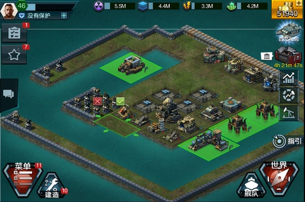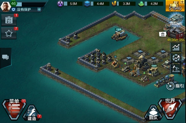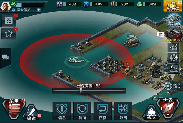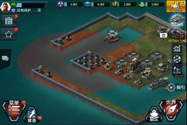 我们可以借助地形编辑功能,把关键的建筑如仓库、大本营等设置在敌舰攻击范围之外的区域,同时利用地形把基地构建成塔防式的城防布局,为敌方预设单一的进攻路线或通道。