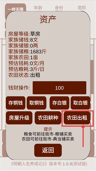 在资产界面点击【农田出租】按钮,能够获得稳定资源,为初期资产积累和后续发展提供助力。