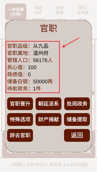 官职界面会展示【从九品】-【民心值】等相关信息,点击【批阅政务】能够提升政绩值,从而推动官职晋升。