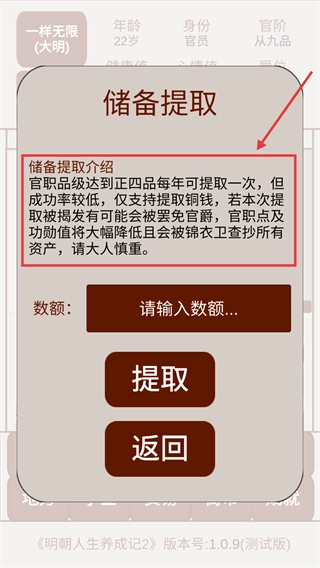储备提取需满足【正四品】品级要求,每年仅限一次且存在风险,输入数额前请务必仔细阅读相关规则。