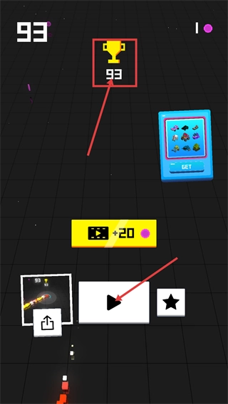 4、关卡结束后,查看【奖杯-93】的分数,点击继续按钮开启下一局,也可观看视频获取【+20】奖励。