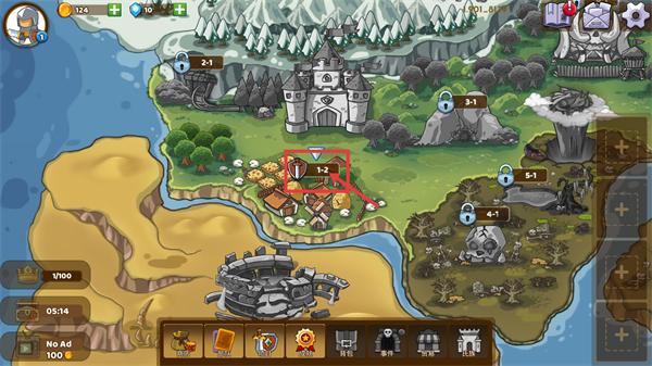 1、挑选【1-2】关卡发起挑战,目前拥有【124】金币与【10】钻石,【2-1】至【5-1】这类关卡要完成前置任务才能解锁。