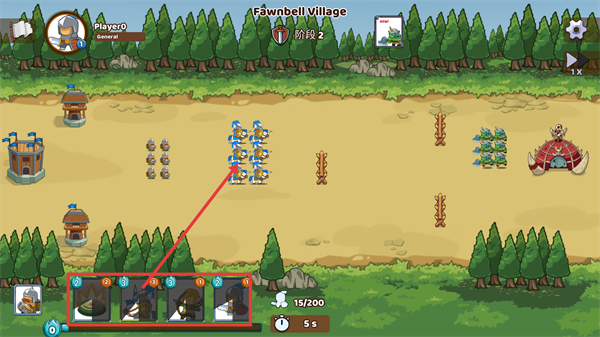2、进入【Fawnbell-Village】的第二阶段,在下方部署不同等级的兵种单位,保持【15/200】的兵力配置来推进战局。