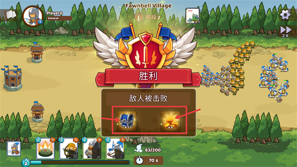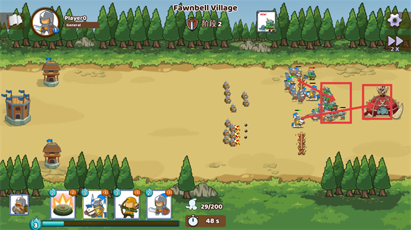 3、在【Fawnbell-Village】的阶段2中,指挥兵力对敌方单位发起进攻,将兵力规模维持在【29/200】,并向敌方营地推进。