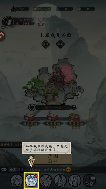 2、进入游戏后的第一步,我们要先点击洞府,学习吐纳之法。