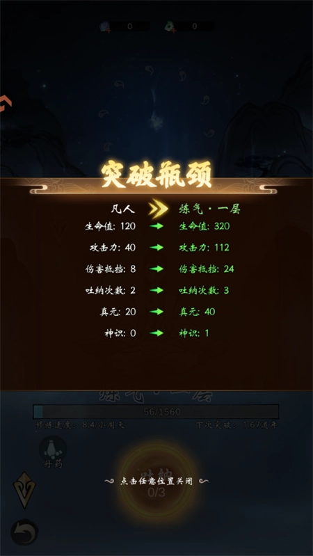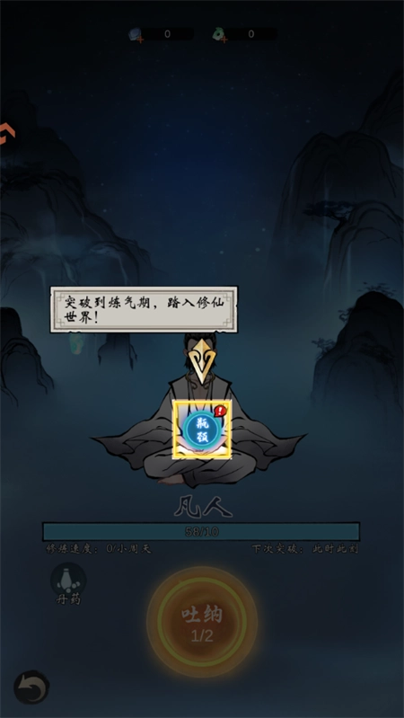 4、点击吐纳按钮,我们就能够吸取天地灵气了。