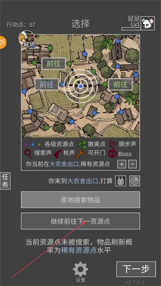 2、进入游戏地图后需进行选择,点击决定是原地搜索还是前往下一个物资点。