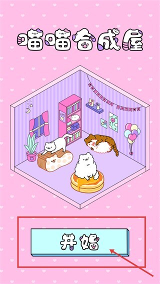 1、在【喵喵合成屋】界面,点击被框选的【开始】按钮,即可进入游戏场景,开启猫咪与家具的合成养成流程。