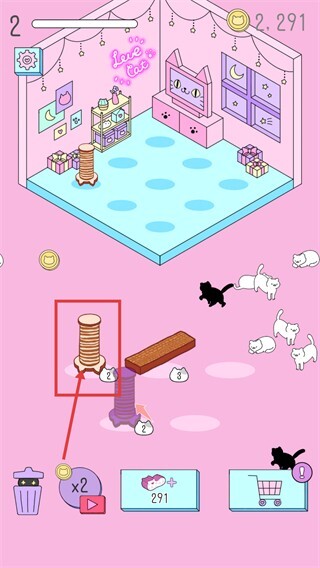 4、合成完成后可得到新家具(例如猫爬架),将其摆放在房间里,能够吸引更多猫咪前来,还能积累金币(当前数量为2291)以推动养成进程。