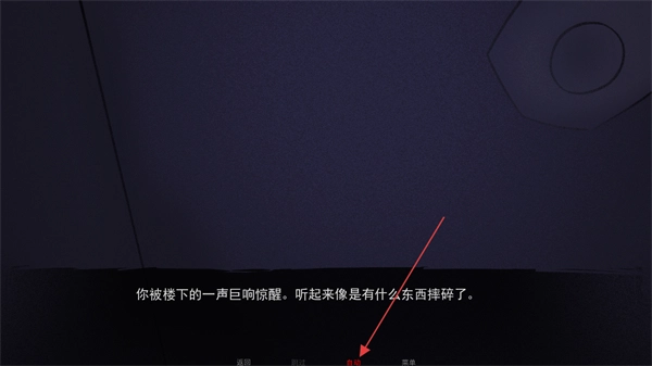 3、当看到剧情文本“你被楼下的一声巨响惊醒。听起来像是有什么东西摔碎了”时,点击自动按钮就能推进剧情。