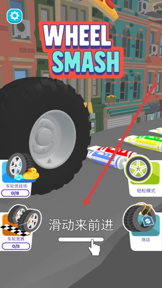 1、打开Wheel-Smash游戏界面后,找到“滑动来前进”的提示,通过滑动屏幕使轮胎启动滚动,从而开启关卡挑战。
