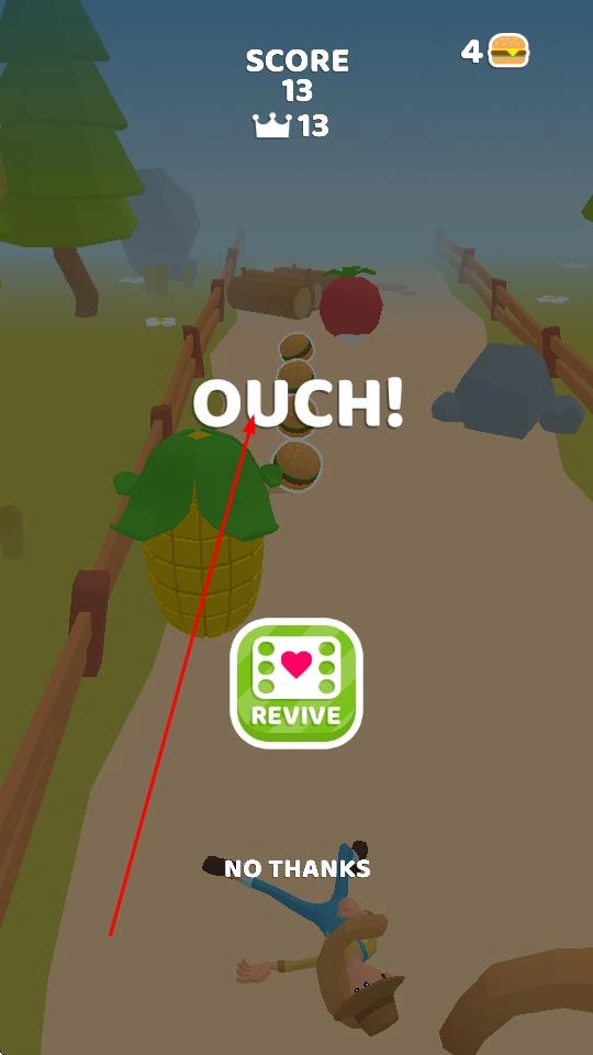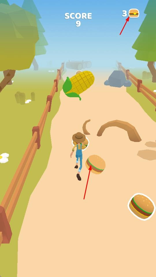 2、进行跑酷时,你可以通过左右滑动屏幕来控制角色的移动方向,以此避开前方与两侧出现的暴躁蔬菜,与此同时点击屏幕就能拾取汉堡道具。