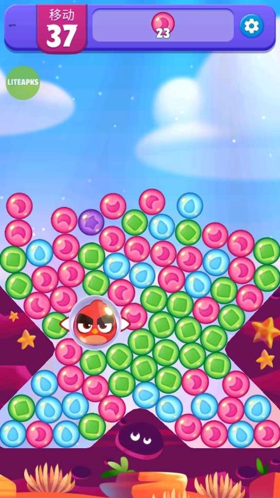 1、第一步是启动《愤怒的小鸟梦幻爆破》,在游戏里,玩家能够通过点击相同的泡泡来让它们消除。