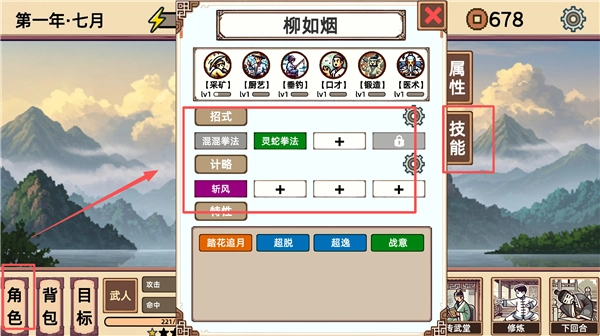 10、点击【角色】进入【技能】界面,玩家可携带上战的招式以及计略,随着角色境界的提升,可携带的招式和计略数量也会增加。