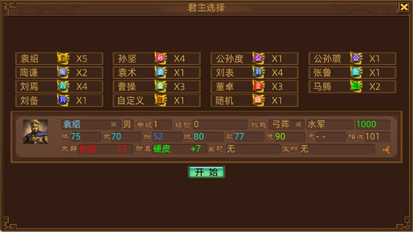 你可以选择袁绍、曹操、刘备等多位三国君主,不同君主的初始兵力、武将配置以及属性技能各有不同,像袁绍一开始就拥有颜良、文丑这类武将,其技能还涵盖了弓阵和水军相关的内容。