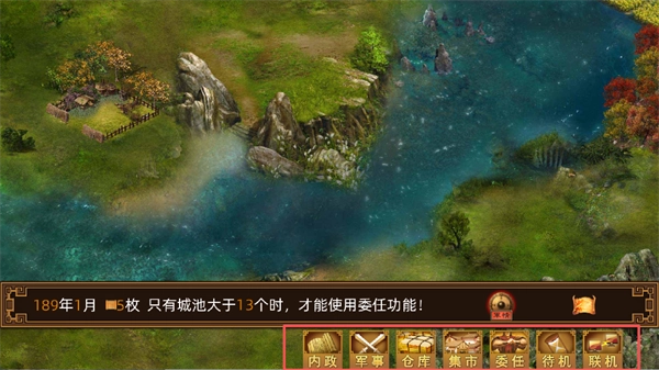 在城镇中能够执行【开发、情报、策略】之类的命令,推动内政发展;此外还可以借助【内政、军事、仓库、集市】等功能来管理城池,当城池数量超过13个时,就能够运用委任功能,从而提高管理的效率。