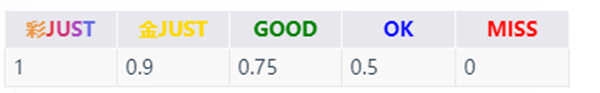 判定结果包含:彩JUST、金JUST、GOOD、OK以及MISS。