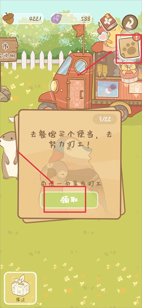 9、去餐馆买个便当,去努力打工这个任务完成后,点击右上角爪子图标也还可以领取任务完成的奖励,奖励领取完后即可开启下一个任务