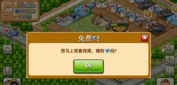 5、看视频。度假村外面有一些视频可以观看,看一次会免费得到一些钻石,钻石是可以用来买金币的,当然如果觉得麻烦,也可以直接氪金钻石,再去兑换成金币即可。