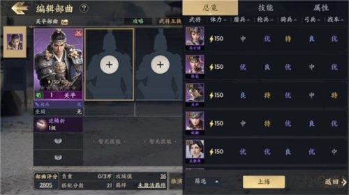 部曲是汉时的军队编制单位,主公可将麾下武将和士兵进行组合,以部曲的形式进行征战。每支部曲最多可以配置3名武将,单支部曲只能上阵一种兵种,可上阵的士兵数量与武将带兵数相关。部曲评分是对单个部曲实力的一种量化显示,评分受部曲属性、技能、部曲兵力影响,有助于主公直观了解敌我双方实力对比。所谓知己知彼,百战不殆,主公在出征前注意也要三思而行哦。